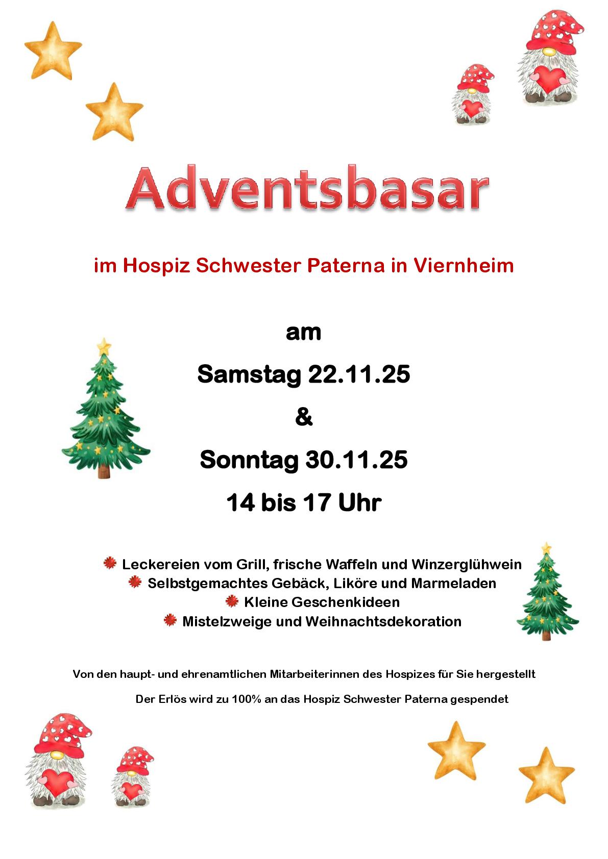 Das Hospiz Schwester Paterna lädt ein zum Adventsbasar am Samstag 22.11. und Sonntag 30.11.2025 jeweils von 14:00 – 17:00 Uhr
