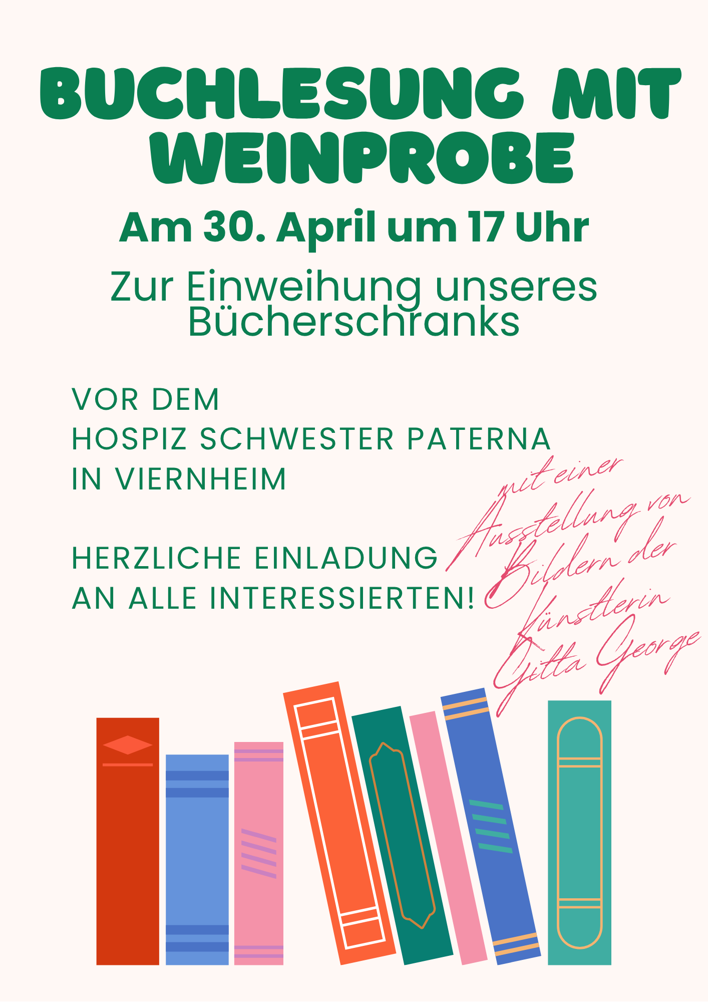 Wir laden am 30. April ab 17 Uhr herzlich zu einer Buchlesung mit Weinprobe vor unserem Hospiz ein. Vernes Federn werden aus ihren Büchern lesen und Wein vom Weingut Jens Göhring darf probiert werden. Und damit auch etwas fürs Auge dabei ist, stellt die Künstlerin Gitta George eine Auswahl ihrer Bilder aus.